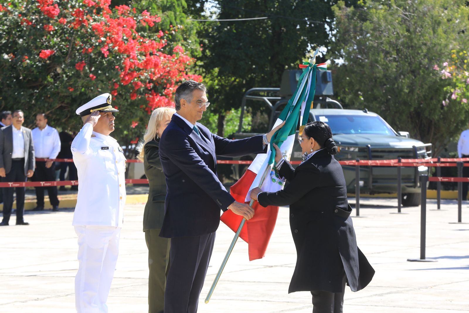 Tras abanderar a las escoltas de cinco escuelas primarias, Américo Villarreal recordó́ que la bandera fue estandarte de identidad de los insurgentes y recoge el tributo necesario a nuestros pueblos originarios.