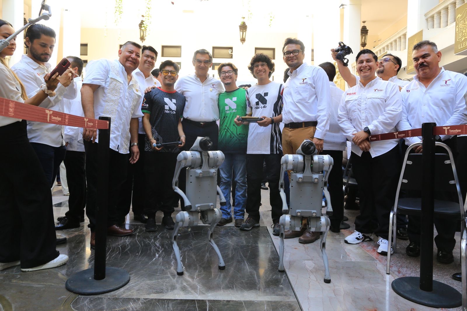 Al término de la ceremonia de honores, el gobernador recibió al grupo de estudiantes de la carrera de Ingeniería en Mecatrónica de la Universidad Politécnica de Victoria, que forman parte del taller-comunidad NIX-Lab y que recientemente tuvieron una destacada participación en un concurso internacional celebrado en Brasil, quienes le presentaron una exhibición de dos robots Unitree Go2 operados a distancia.