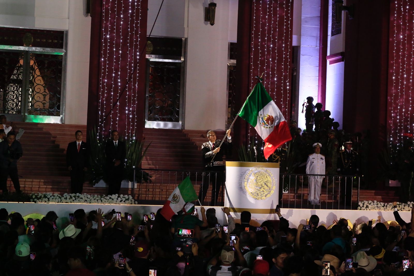 Desde la escalinata principal de Palacio de Gobierno, el gobernador de Tamaulipas recibió la bandera nacional de manos de la escolta del 77 Batallón de Infantería y exclamó.