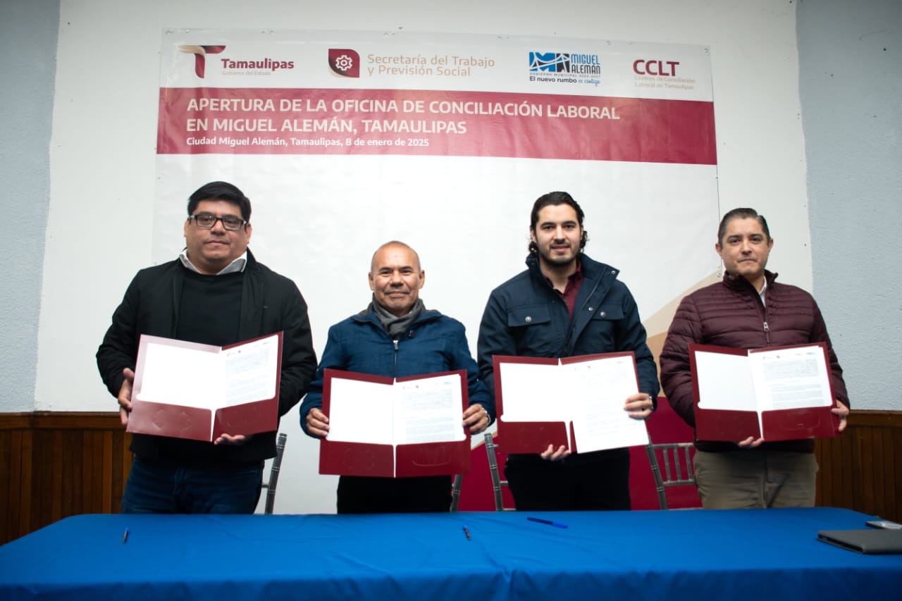 Miguel Alemán, Tamaulipas.- Con la finalidad de acercar la justicia laboral, fue inaugurada la Oficina Regional del Centro de Conciliación Laboral en el municipio de Miguel Alemán, cuya apertura estuvo a cargo de Luis Gerardo Illoldi Reyes, secretario del Trabajo y Previsión Social en Tamaulipas, y del director general del Centro de Conciliación Laboral de Tamaulipas, José Ives Soberón Mejía.